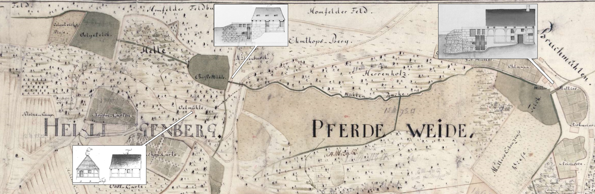 Zeichnung von der "Bruch Mühle" mit 2 wasserräder. Ca. 1740